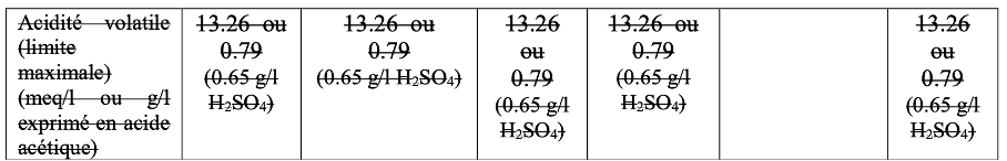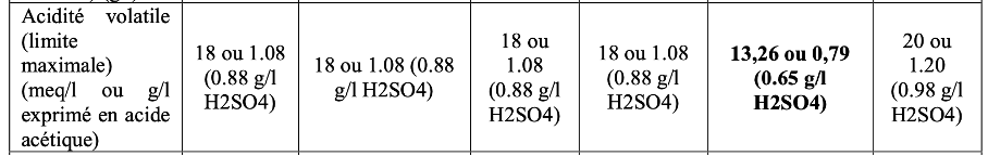 Acidité volatile (limite maximale) (meq/l ou g/l exprimé en acide acétique) :13,26 ou 0,79 (0.65 g/l H2SO4)