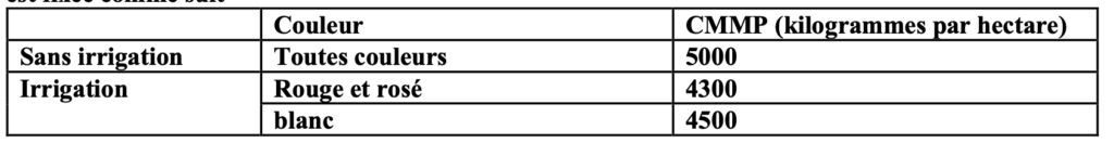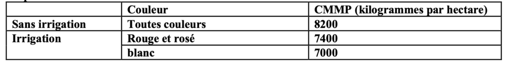 Les parcelles de vignes en place à la date du 1er septembre 1995 et présentant une densité comprise entre 3 300 et 3 999 pieds par hectare continuent de bénéficier jusqu’à la récolte 2048 incluse, du droit à l’appellation d’origine contrôlée avec une réduction de rendement de 18% par rapport au rendement fixé pour une récolte donnée. La charge maximale moyenne à la parcelle (CMMP) pour ces parcelles est fixée comme suit :