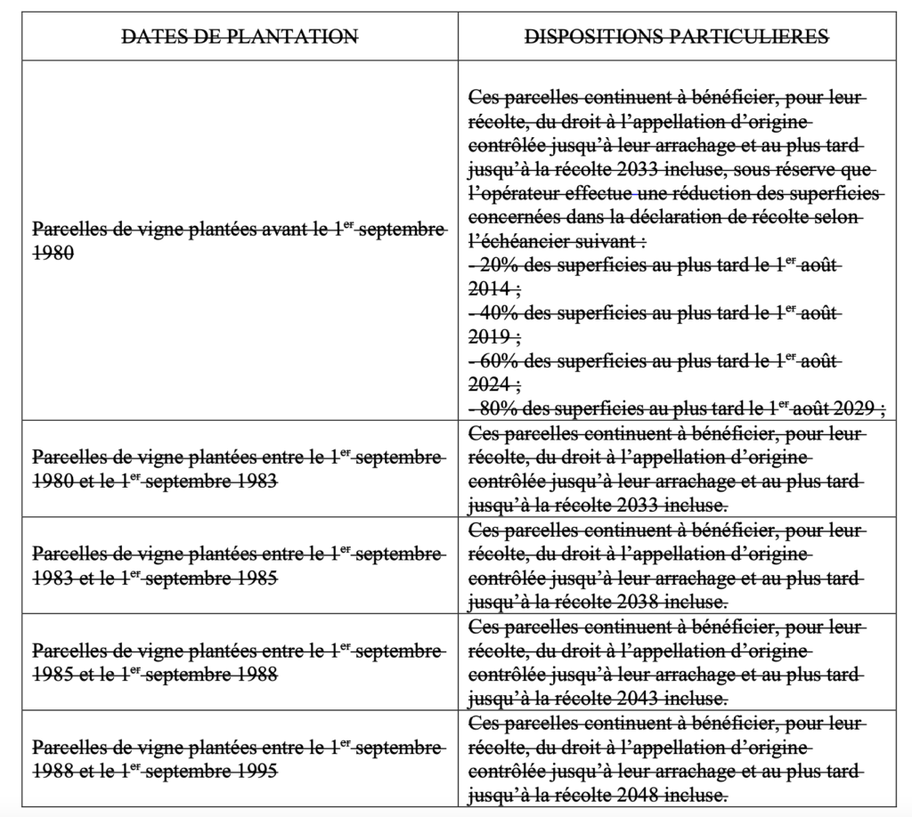 Les parcelles de vigne plantées à la date du 1er août 1990 et celles acceptées à titre exceptionnel pour permettre l’achèvement d’ensembles culturaux homogènes dans le décret du 2 avril 1990 et dont la densité est inférieure à 4000 pieds par hectare continuent à bénéficier, pour leur récolte, du droit à l’appellation d’origine contrôlée sous réserve du respect des autres dispositions du présent cahier des charges et sous réserve des dispositions suivantes :