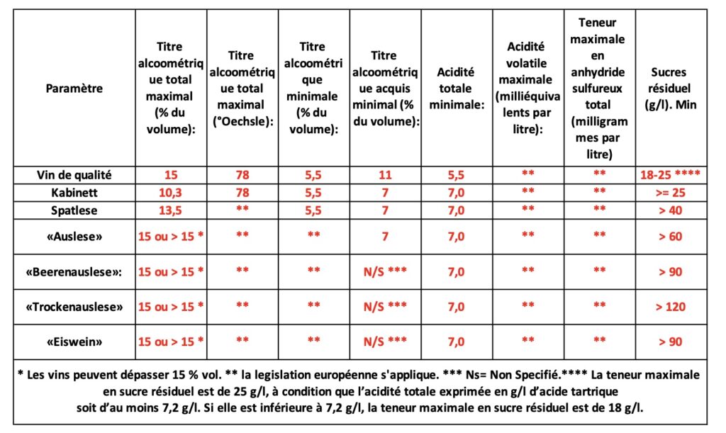 Le titre alcoométrique total des vins portant un attribut spécial (Spatele, Auslese etc) peut dans certains cas dépasser 15 % vol. Le titre alcoométrique total des vins portant les attributs spéciaux «Kabinett» et «Spätlese» a été limité.Le titre alcoométrique total des vins portant les attributs spéciaux «Kabinett» et «Spätlese» a été limité afin de préserver la légèreté typique