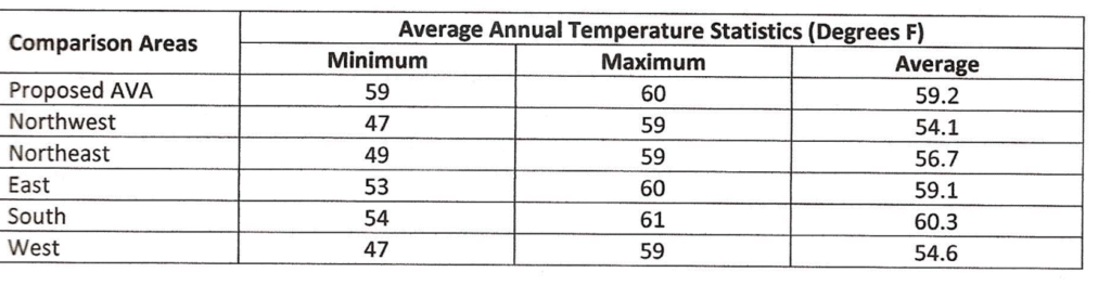 Le tableau ci-dessous illustre les températures annuelles moyennes des zones de comparaison. En général, les zones ouest, nord-ouest et nord-est sont plus fraîches que l’AVA de et présentent une plus grande amplitude thermique moyenne (tableau 5). La zone sud est plus chaude que l’AVA de tryon foothills , les températures augmentant progressivement vers le sud. La zone de comparaison est présente une température annuelle moyenne approximativement identique à celle de l’AVA proposée, mais une température minimale moyenne bien inférieure en raison de la présence des montagnes du Sud, plus élevées à l’intérieur de ses limites.