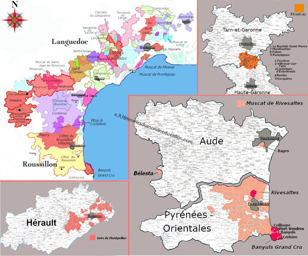 – la « Tramontane », vent dominant de nord-ouest (130 jours par an), violent et desséchant ; bénéfique pour assainir l’atmosphère des maladies cryptogamiques, elle s’avère souvent destructrice par ses effets mécaniques sur les jeunes rameaux de vignes au printemps ; elle est aussi responsable de la propagation des incendies en été ;
