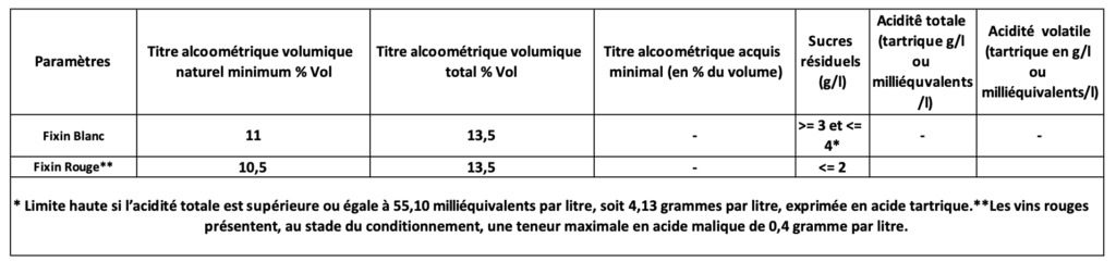L’appellation Fixin est réservée aux vins tranquilles blancs ou rouges secs élaborés sur le territoire des communes suivantes du département de la Côte-d’Or : Brochon et Fixin en Bourgogne.