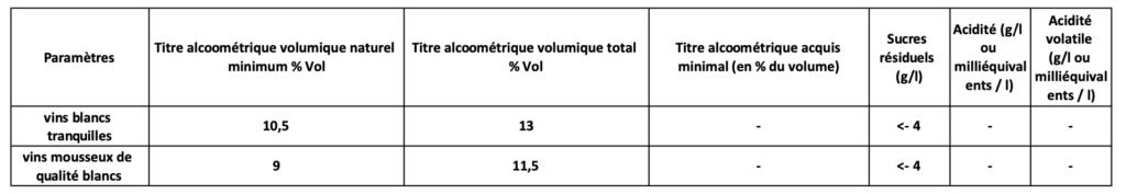 – Les vins mousseux, après prise de mousse, ne dépassent pas, en cas d’enrichissement du moût, le titre alcoométrique volumique total de 11,50 %.