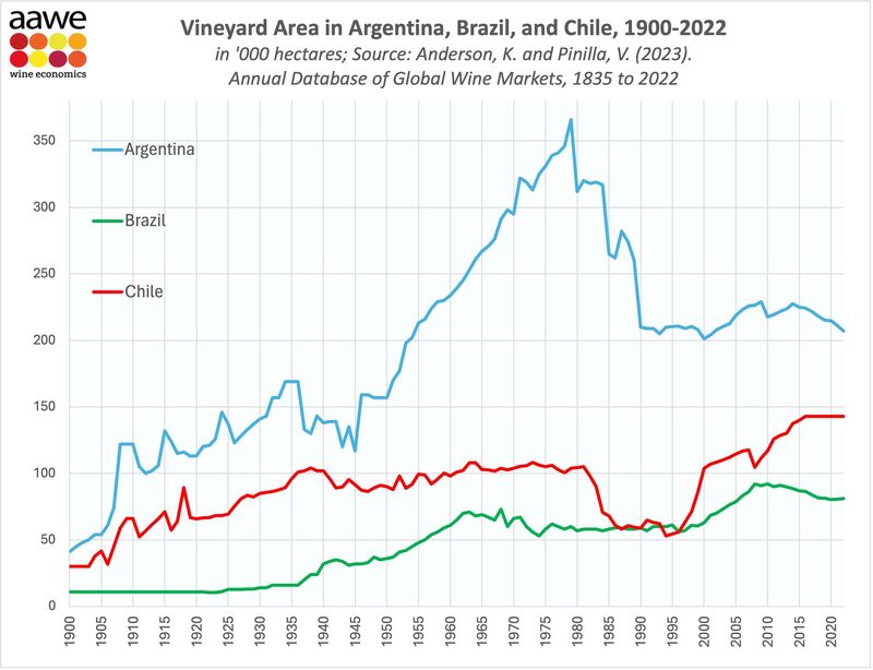 Vineyard Area in Argentina, Brazil, and Chile, 1900-2022