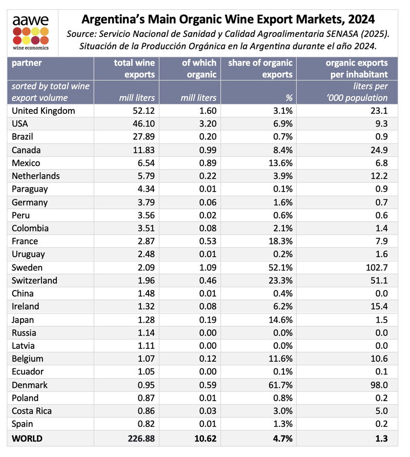 En 2023, l’Argentine a exporté 713 millions de dollars [8] de vin [9], ce qui en fait le 10e exportateur mondial de vin. La même année, le vin était le 19e produit le plus exporté par l’Argentine. Les principales exportations de vin d’Argentine sont dirigées vers : les États-Unis (190 millions de dollars), le Royaume-Uni (113 millions de dollars), le Brésil (89,3 millions de dollars), le Canada (48,5 millions de dollars) et le Mexique (26,1 millions de dollars).