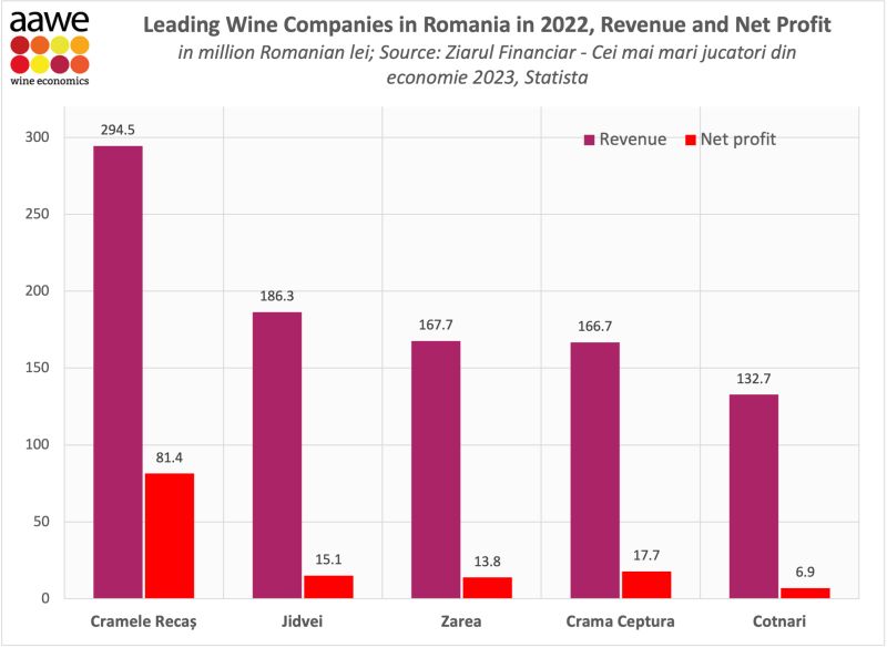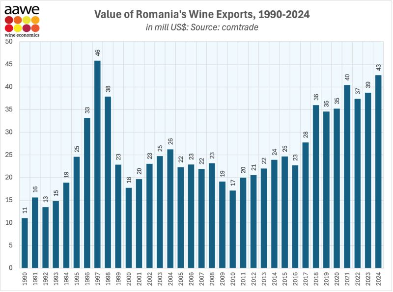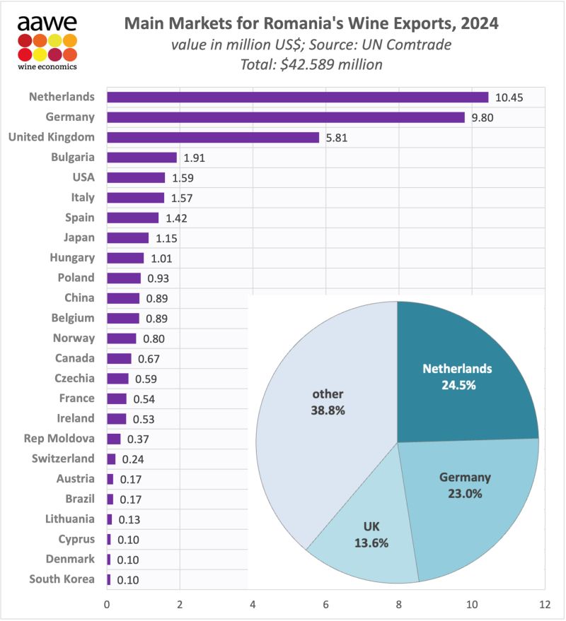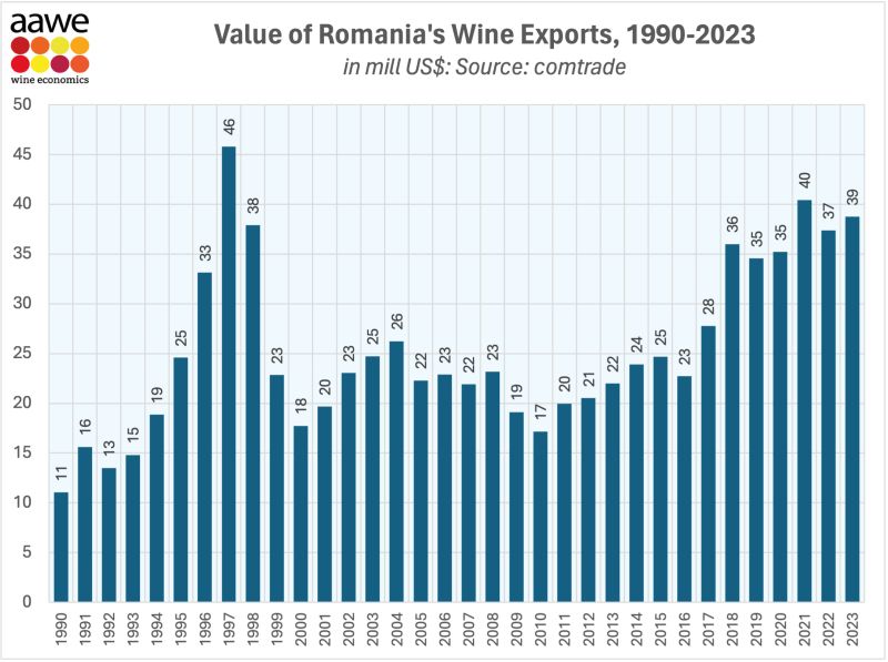 En 2023, la Roumanie a exporté 31,8 millions de dollars [9] de vin[10], ce qui en fait le 33e plus grand exportateur de vin au monde. Les principales destinations des exportations de vin de Roumanie sont les Pays-Bas (12,1 millions de dollars), l’Allemagne (7,28 millions de dollars), les États-Unis (1,78 million de dollars), le Royaume-Uni (1,18 million de dollars) et le Japon (1,11 million de dollars).