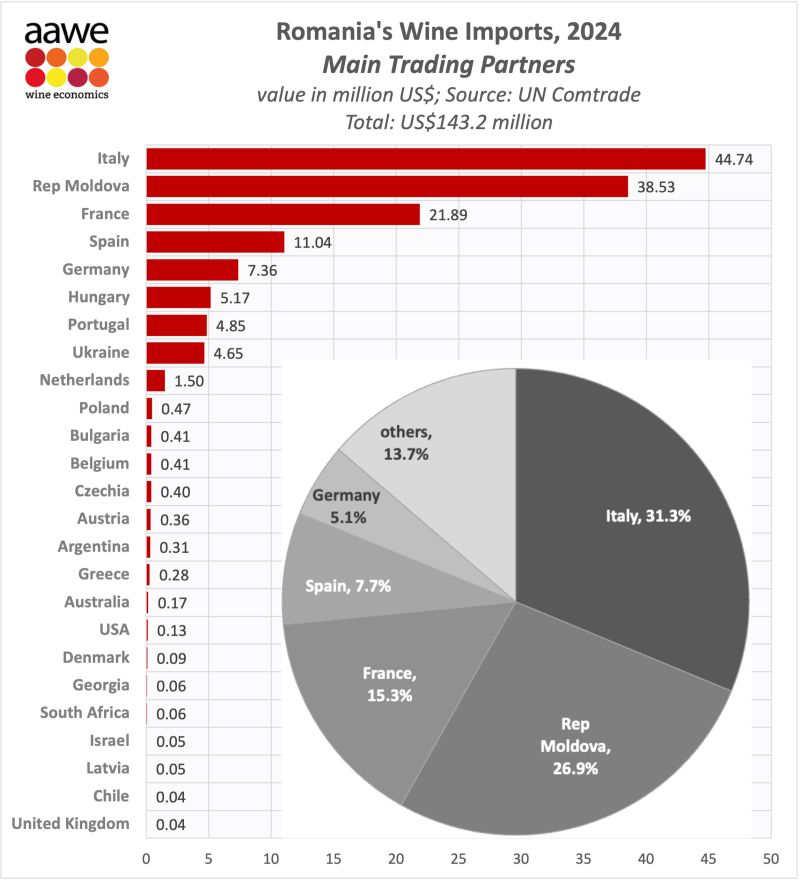 En 2023, la Roumanie a importé 141 millions de dollars de vin. La Roumanie importe du vin principalement de l’Italie (40,4 M$), de la Moldavie (34,7 M$), de France (21,8 M$), d’Espagne (11,8 M$) et d’Allemagne (11,5 M$).