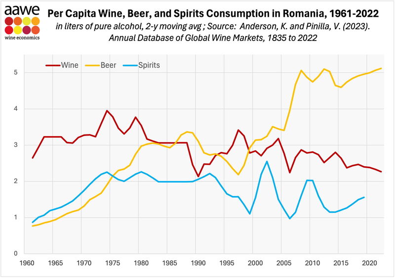 La consommation de vin par habitant a atteint 29,5 litres (7,8 US gallons) en 2021 en Roumanie [11]. Cela représente 41,0 % de plus que l’année précédente. Historiquement, la consommation de vin par habitant en Roumanie a atteint un sommet historique de 40,1 litres (10,6 gallons) en 1984 et un creux historique de 12,2 litres (3,2 gallons) en 2018[12]. La Roumanie se classe au 7e rang du groupe de 150 pays suivis en termes de consommation de vin par habitant.