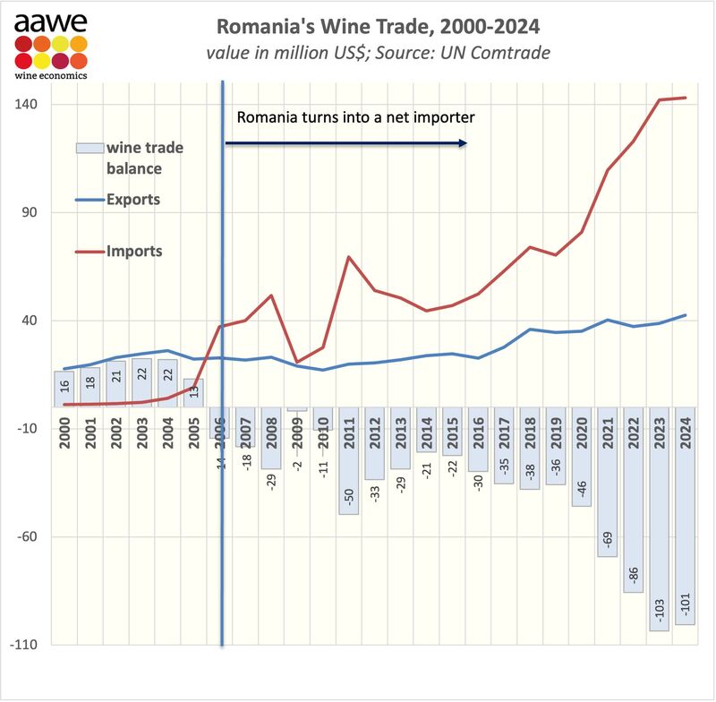 Peu connu, la Roumanie est un importateur net de vin depuis 2006. Si ses exportations ont augmenté, ses importations ont explosé. En 2024, la Roumanie a enregistré un déficit commercial viticole d’environ 100 millions de dollars américains.