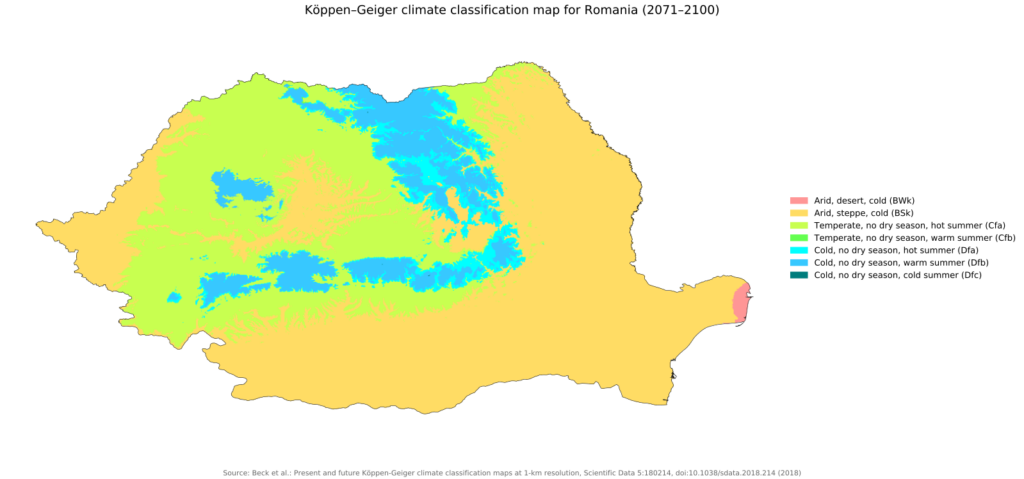 La température annuelle moyenne est de 11° C (51,8 ° F) dans le sud et le centre-sud et de 8° C (46,4 ° F) dans le nord-est. À Bucarest, la température varie de -5° C (23 ° F) en janvier à 29 ° C (84,2 ° F) en juillet et août, avec des températures moyennes de -3 ° C (26,6 ° F) à Janvier et 23 ° C (73,4 ° F) en juillet et août (Source. Wkipedia.org). Les précipitations annuelles varient de 1 000 mm (38 po) à 650 mm (25,6 po) dans le centre de la Transylvanie mais elles sont de 530 mm (20 po) et descendent à moins de 400 mm en Moldavie et moins de 400 mm ( 15.5 po) à Constanţa sur la mer Noire.