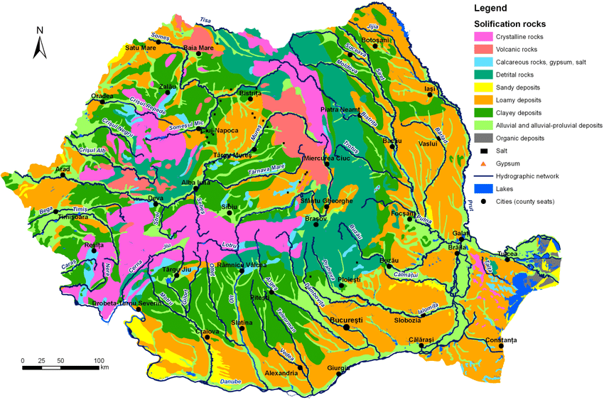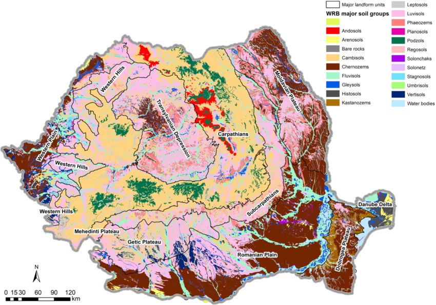 Les sols des vignobles roumains sont d’une grande diversité. Topographiquement, les conditions varient de la Mer Noire (25 m d’altitude pour Constanta) à des altitudes de 600 à 700 m. Entre ces altitudes, on trouve différentes formes de relief: plaines alluviales, plaines (de différents types), des contreforts dans des Carpates, des collines et des plateaux avec des conditions variées de types de roches, de topographie, d’hydrologie et qui créent de nombreux climats et de microclimats.