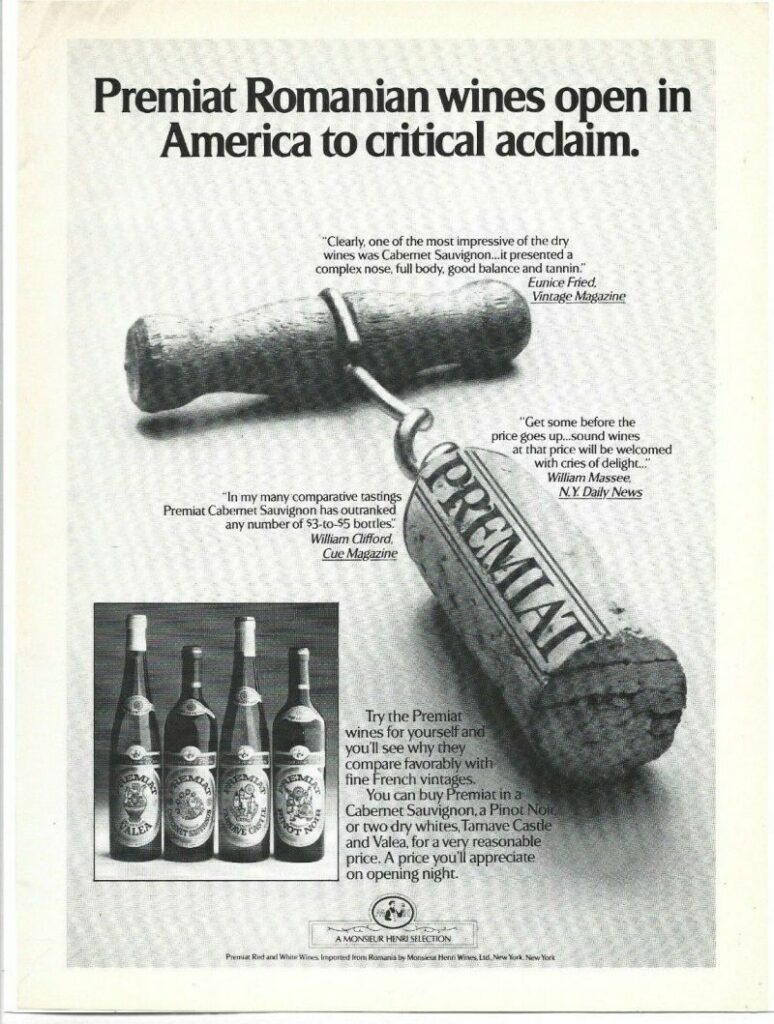 Fin 1970, un bien étrange marché vit le jour avec Pepsi Cola qui vendait ses colas en Roumanie en échange de vins et d’expertise viticole californienne. Les exportations ne décollèrent jamais, stagnant aux alentours de 5% sauf au Royaume-Uni, et en Bulgarie, où les vins obtinrent un franc succès, en particulier avec le pinot noir.