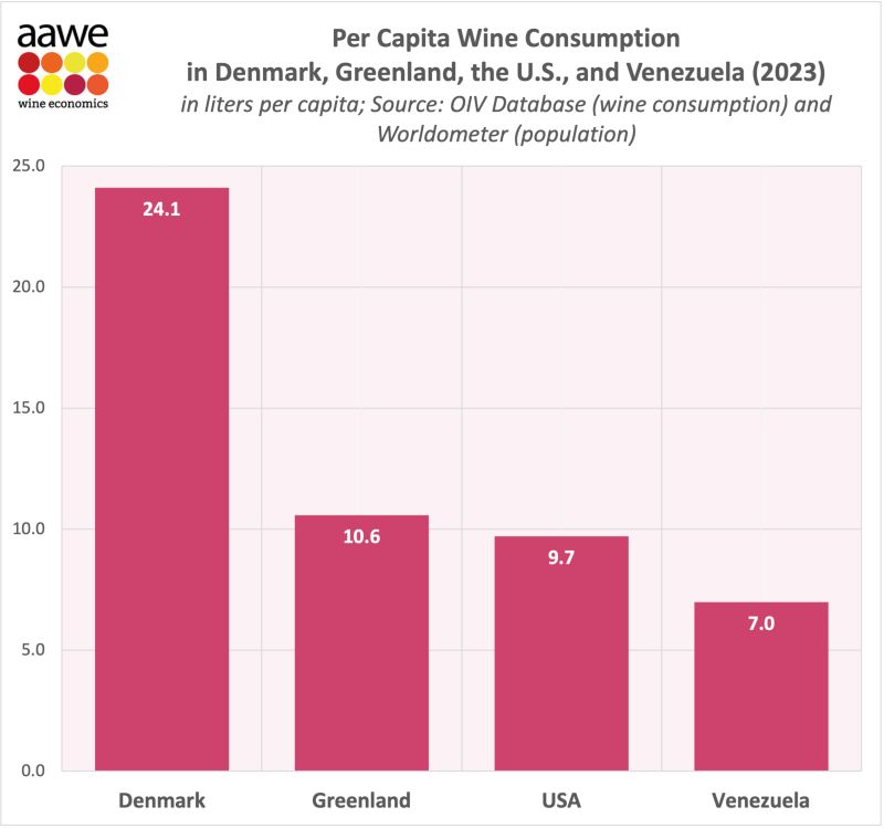 Per Capita Wine Consumptionin Denmark, Greenland, the U.S., and Venezuela (2023)